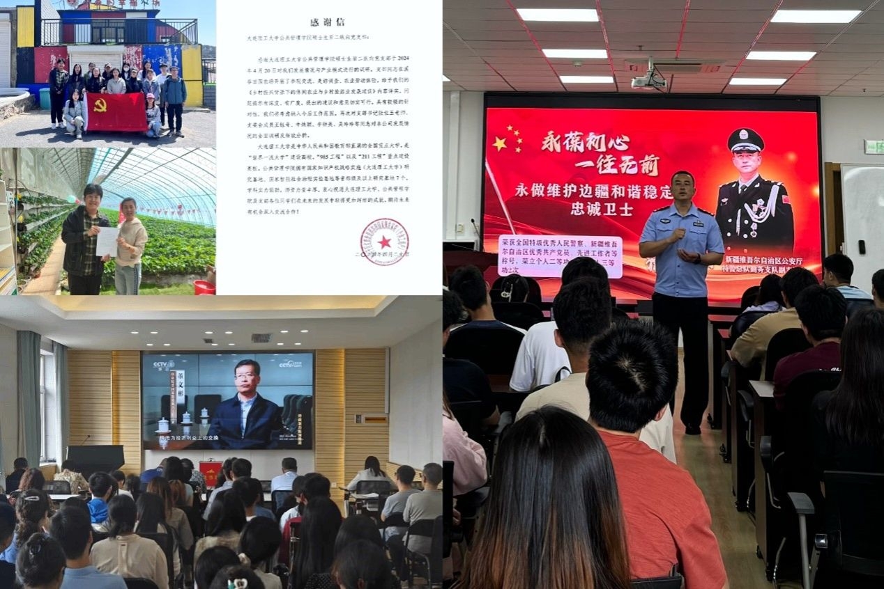 学院充分发挥党建引领作用,积极探索党建共建新模式,与地方政府、企事业单位、社区等建立广泛的党建联建关系,共同开展党纪学习教育。学院硕士生党支部深入大连周边农场调研产业模式,并将调研成果整理形成发展建议递交农场负责人,被农场采纳并收到感谢信,用实际行动为新时代辽宁全面振兴积蓄动能。学院党委与能动学院党委合作,邀请MPA在校生—全国特级优秀人民警察张晨阳开展讲座,激励广大学生党员学习先进,感悟榜样力量。