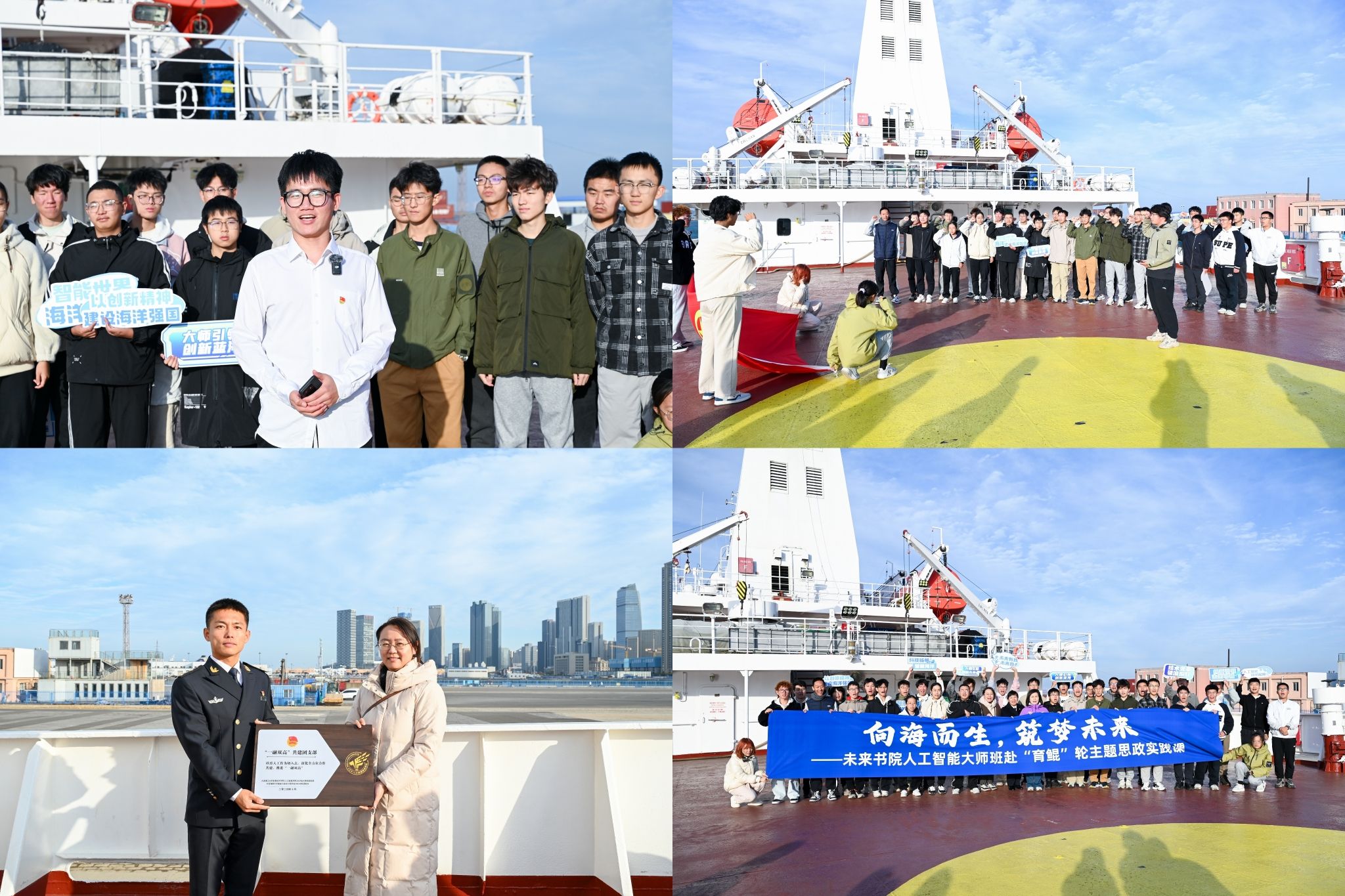 为学习贯彻党的二十届三中全会精神、习近平总书记给中国国际大学生创新大赛参赛学生代表的回信精神和给中国海洋大学全体师生的回信精神,引导学生深入领会海洋强国战略,激发科技报国的青春使命,10月27日,我校未来书院师生赴大连海事大学“育鲲”轮开展“向海而生逐梦未来”主题大思政课。大连海事大学“育鲲”轮船长白军、马克思主义学院何美子副教授,我校未来技术学院(人工智能学院)党委书记、未来书院院长侯庆敏,学院副院长、大师2401班主任郭艳卿,党委副书记、副院长、未来书院副院长孙智妍,相关教师代表、党员代表及大师2401班全体学生参加活动。