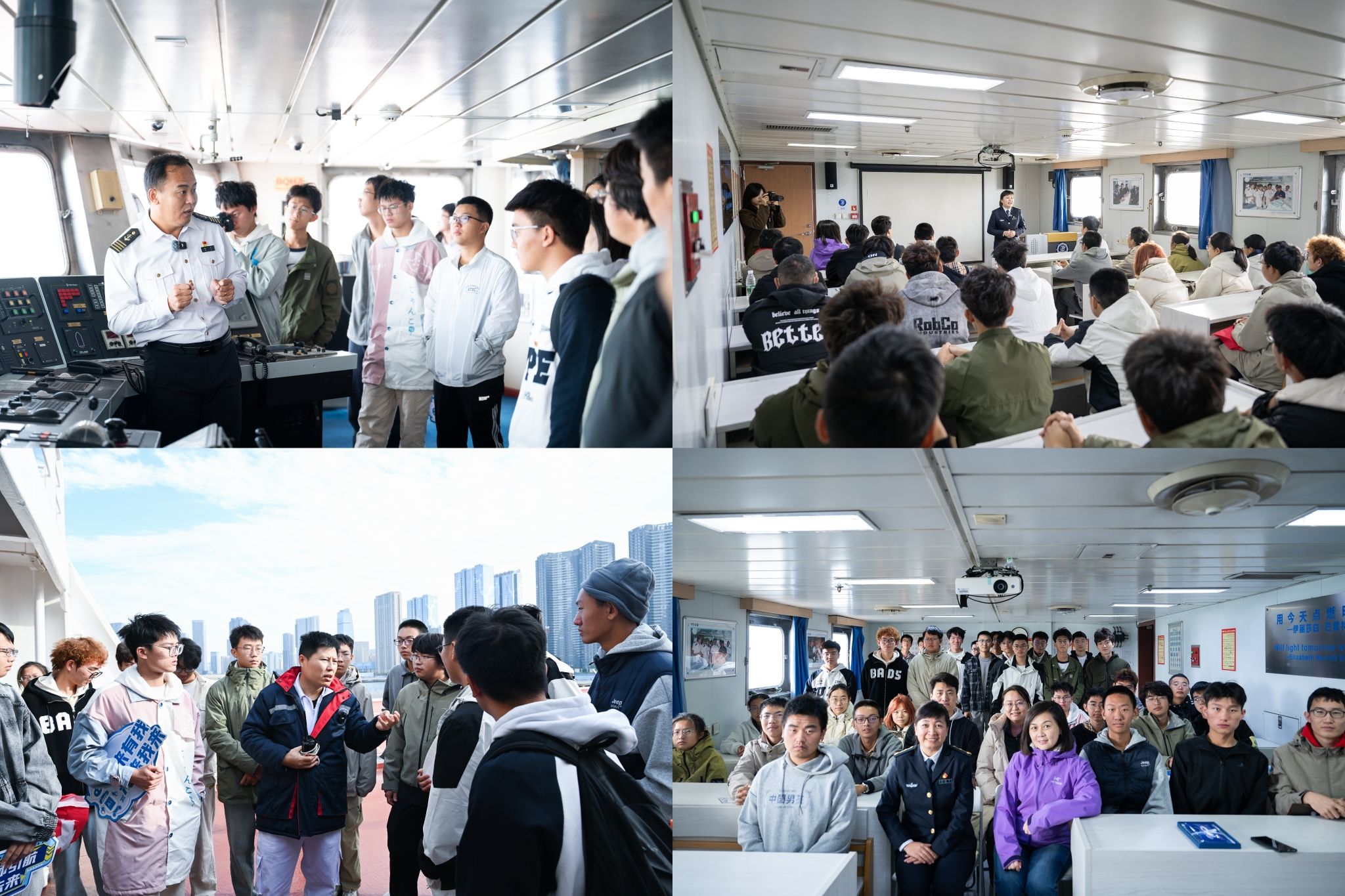 同学们参观了驾驶甲板、主甲板等船内构造,学习航海和船舶知识;在和船长互动中,思考海洋强国战略的具体实践,树立为建设海洋强国接续奋斗的使命。