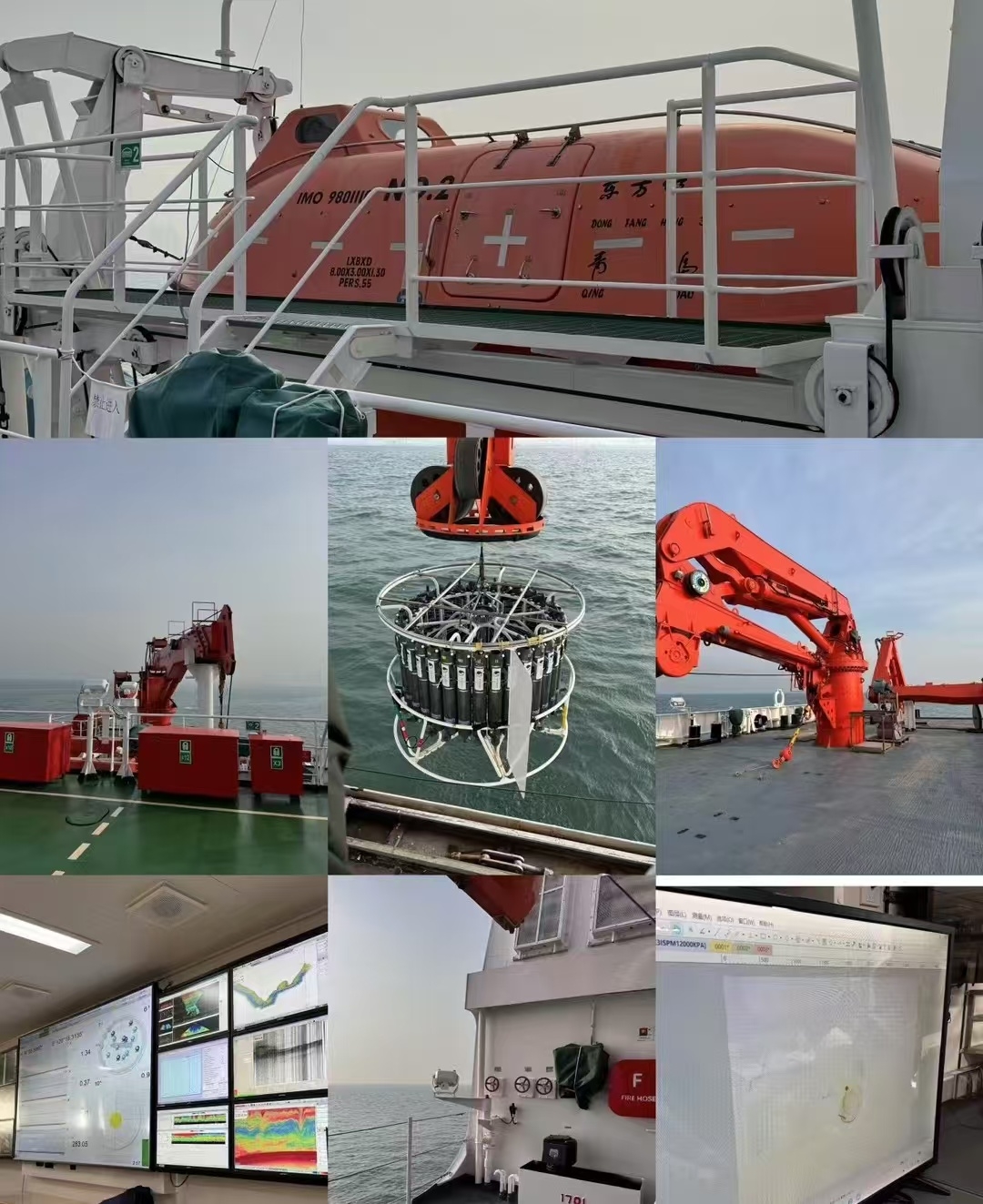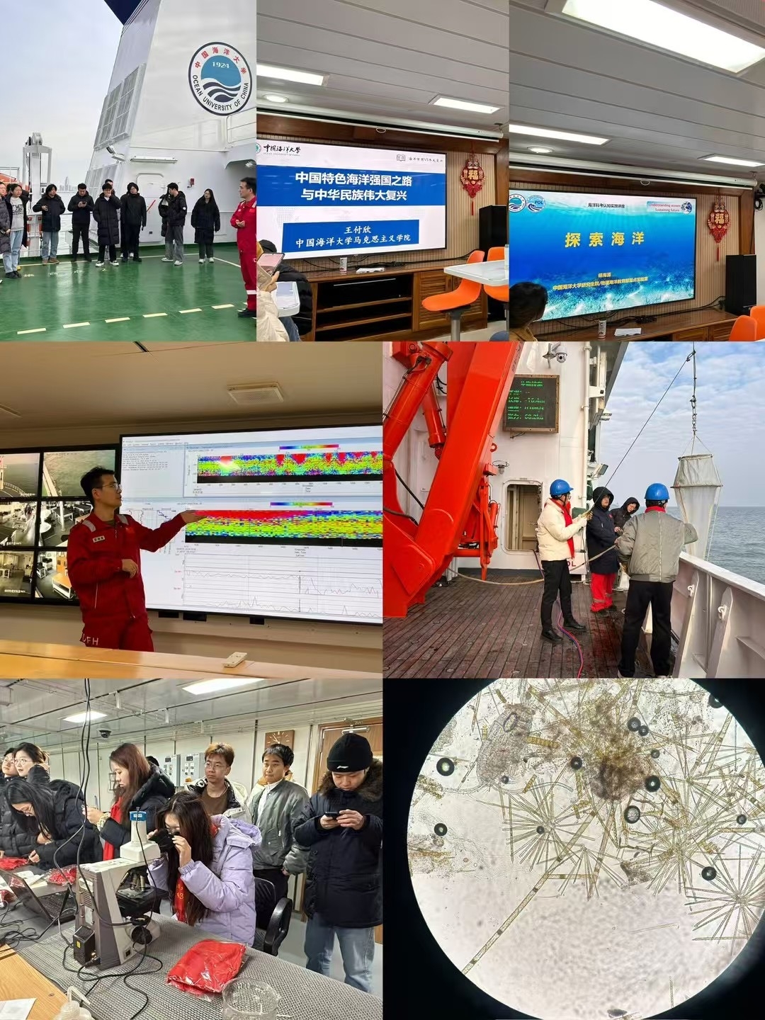 参观实践环节,师生们倾听“东方红3”船建设历史、亲身体验海洋科考实验。同学们在CTD(温盐深测量仪)操作区,尝试操控仪器测量胶州湾海水温度、盐度等数据;在干湿实验室,使用显微镜观测海水中的海洋生物;在逃生演练环节,迅速穿好救生衣、带上保温服,有序集合进入逃生艇……实验室老师从海洋水文、海洋气象、海洋生物、海洋化学、海洋地质等方面讲授船载先进海洋调查仪器设备的相关知识,传授海洋调查的经验,博得阵阵掌声。