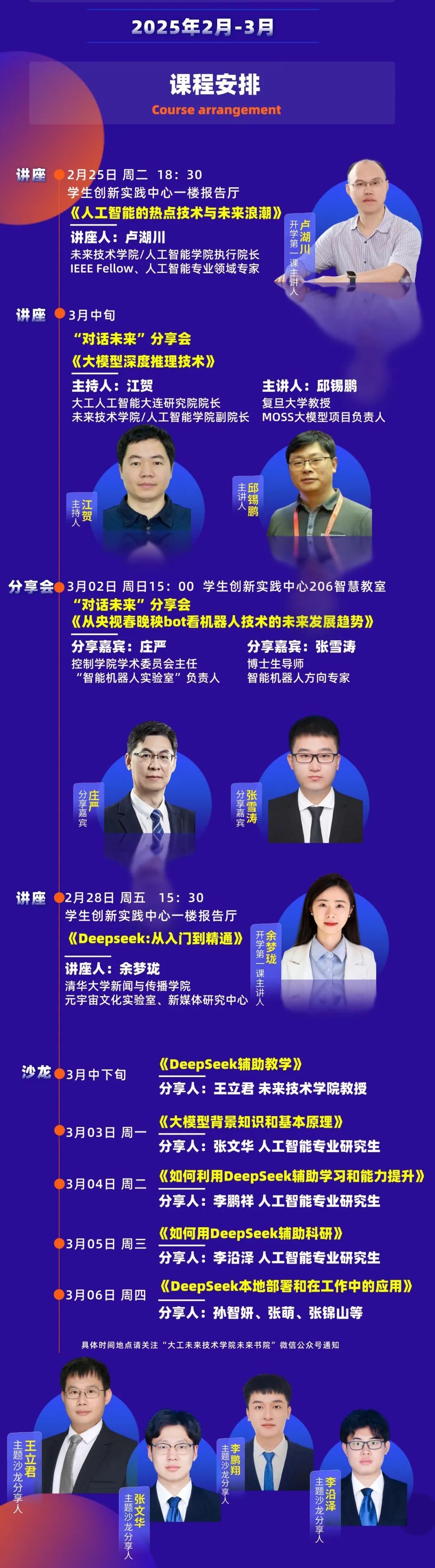 本期活动也是未来技术学院/人工智能学院春季“能力超市”AI应用赋能篇的系列活动的首场讲座,后续将邀请清华大学新闻与传播学院博士后余梦珑、复旦大学教授邱锡鹏等专家,围绕DeepSeek使用、大模型深度推理、机器人技术等开展专家讲座、主题分享、专题沙龙等活动,通过“知识+实践+跨界”三维赋能打造沉浸式学习生态,助力全校师生对接专家学者、了解行业前沿,在人工智能场景应用、教育教学改革等方面实现全面赋能。