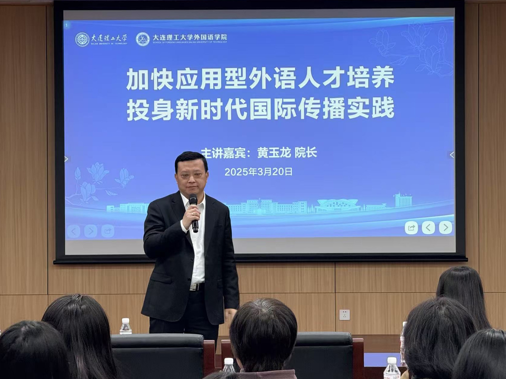 会上,黄玉龙围绕推进高素质应用型外语人才培养和助力中国国际传播等内容,结合自己26年深耕国际传播一线的实践经验,从中国国际进口博览会出发,为师生分析了新时代背景下中国国际传播工作面临的新发展形势和机遇挑战。他指出,在中国走向世界舞台中央的关键时期,主动、自然地传播中国故事尤为重要,国际传播的目标是让世界了解并喜欢中国,外语及新闻传播专业学生在新时代讲好中国故事中承担了重要责任。同时勉励同学们牢记“语言是基础,专业是支撑,文化是关键”,筑牢深厚的语言功底、跨文化的思维能力和技术素养,积极投身国际传播事业,成长为面向未来的高素质外语人才。