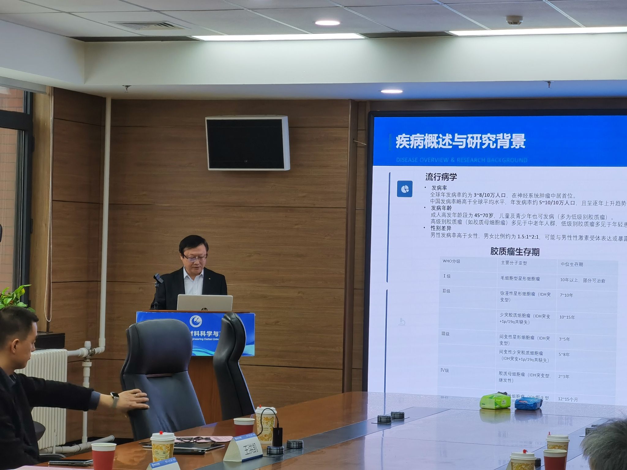 黄昊教授首先对项目的总体情况进行了介绍,并强调疑难及复发胶质母细胞瘤(GBM)是神经肿瘤学中最致命的疾病之一,其治疗难度大、预后差、术后易复发、手术致残及致死率高。传统放化疗因肿瘤细胞对射线耐受及耐药性导致治疗效果不佳,亟须融合材料科学、临床医学等多学科在药物递送系统、局部治疗材料等方向实现关键技术突破。项目旨在自主开发新型诊断、微波热治疗、多药物间质内化疗一体化铁基磁性纳米胶囊,完成微波热疗仪原型机,实现热疗温度的精准控制,为复发及难治性GBM患者提供新的治疗路径。