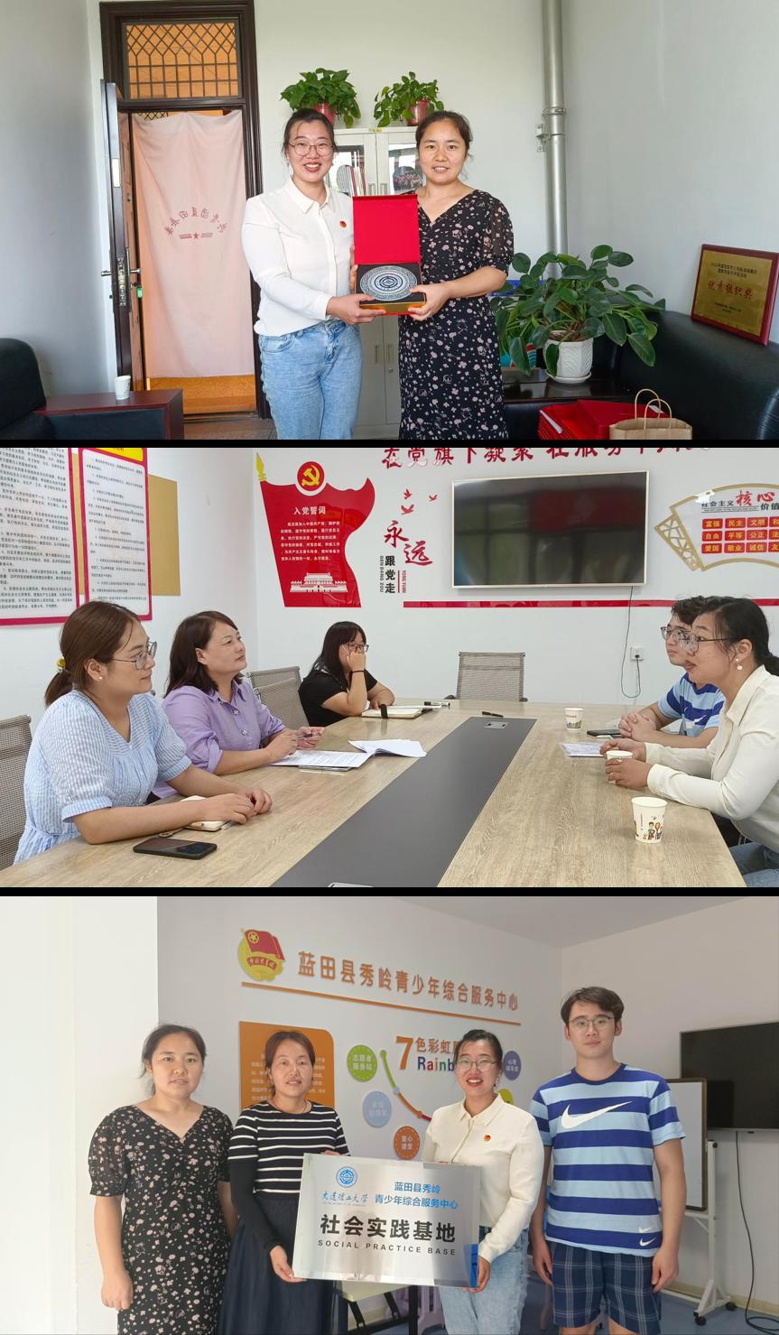 团队指导教师孙天舒前往蓝田县实地考察交流,并向“秀岭青少年综合服务中心”授予大连理工大学社会实践基地牌匾,进一步拓展实践形式,拓宽合作的深度和广度。下一步,实践团将以蓝田县新城社区、秀岭青少年综合服务中心为试点,开展“筑梦启航”线上义务辅导志愿活动,进一步发挥实践团在推进新时代文明实践过程中的示范作用,在实践中砥砺前行,在奋进中告白祖国。