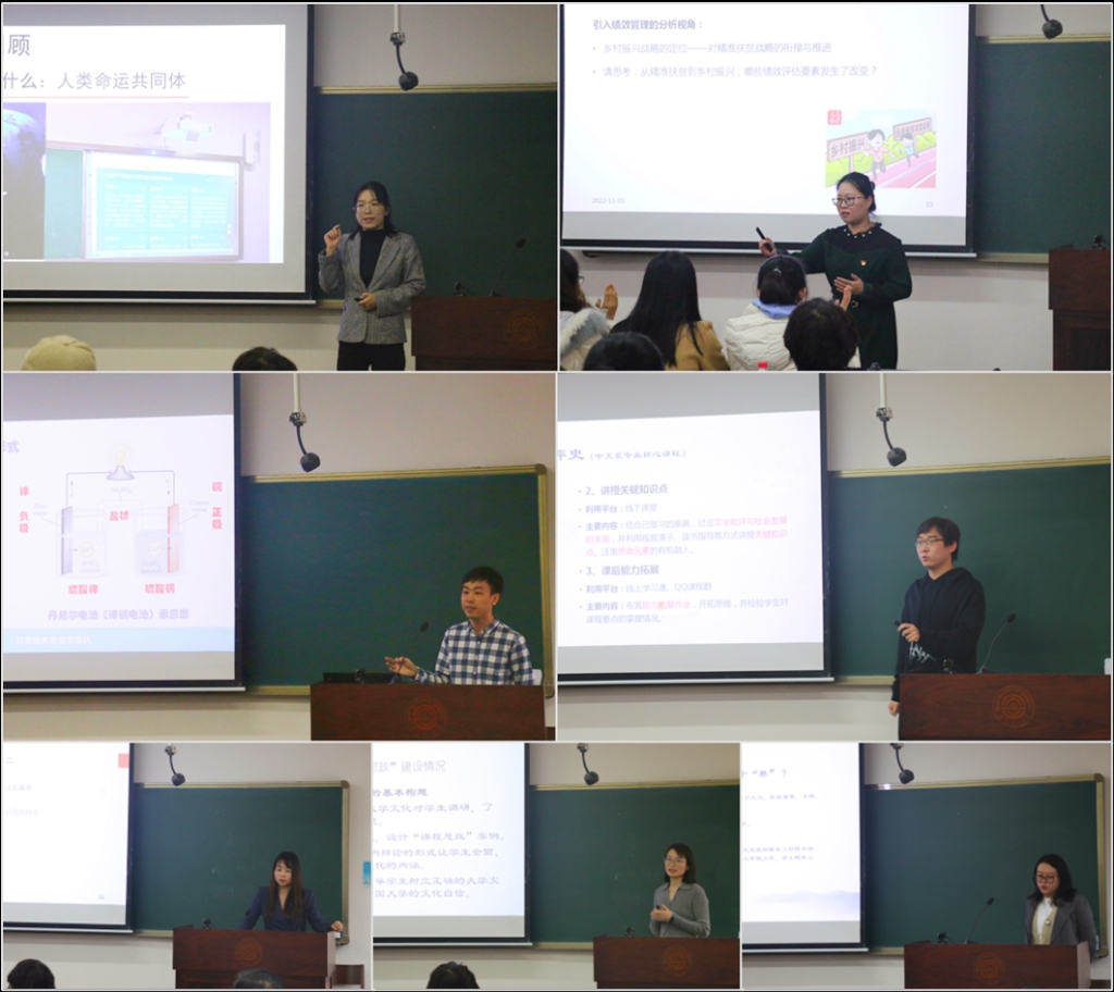 经过赛前的精心准备,哲学系姜含琪老师基于《中国古典哲学原著选读》课程、科学学与科技管理研究所王勇臻老师基于《科学技术史》课程、中文系徐晓老师基于《中国文学批评史》课程、公共管理系张弘老师基于《绩效管理》课程、新闻与传播学系胡晓娟老师基于《马克思主义新闻论著选读》课程、哲学系孙慧中老师基于《批判性思维》课程、高等教育研究院王晓玲老师基于《教育文化学》课程,分别进行了5分钟的说课和10分钟的代表知识点现场教学,对教学中“课程思政”元素的精心设计进行展示,同时表现出特色各异的教学风格。