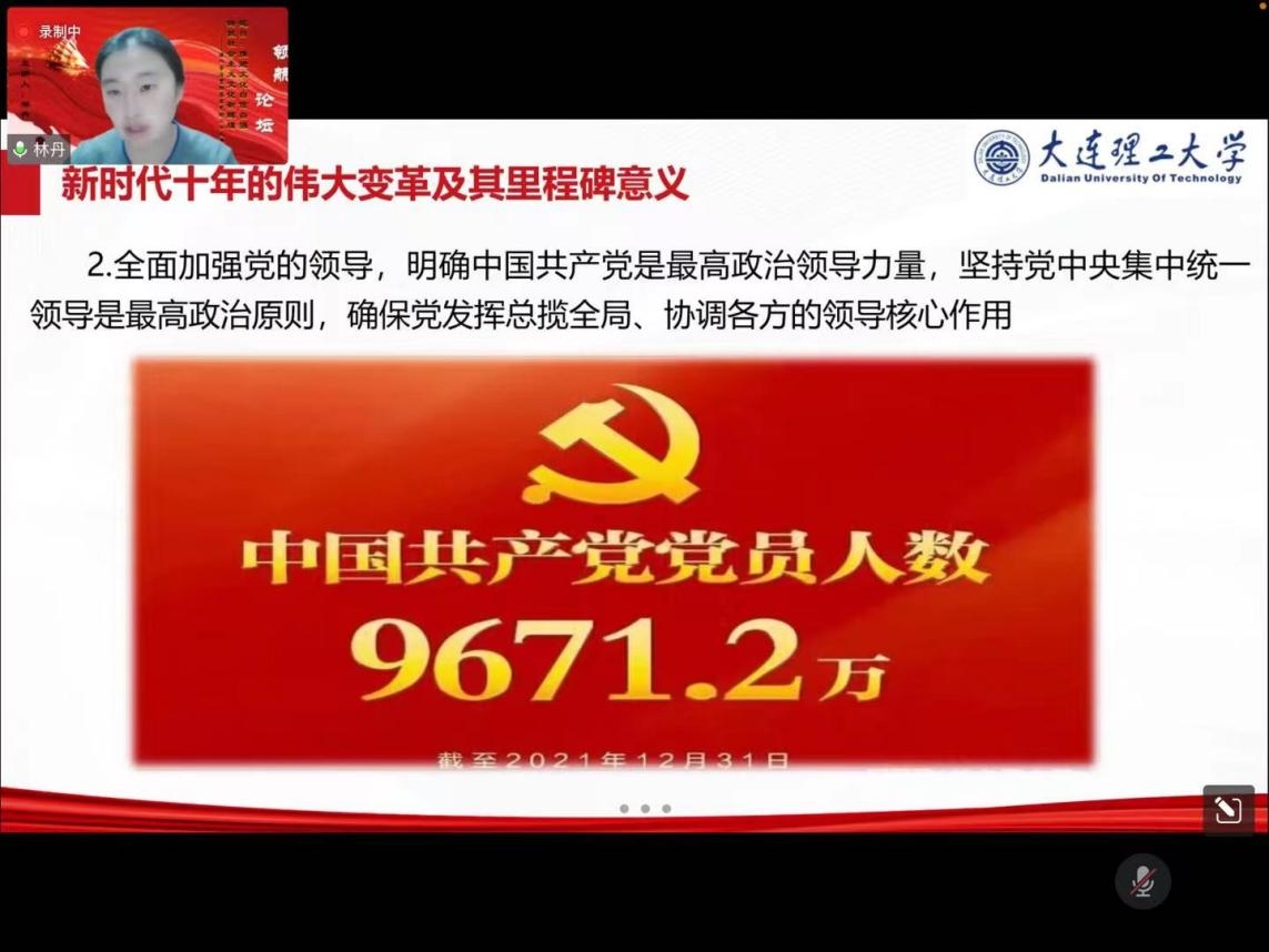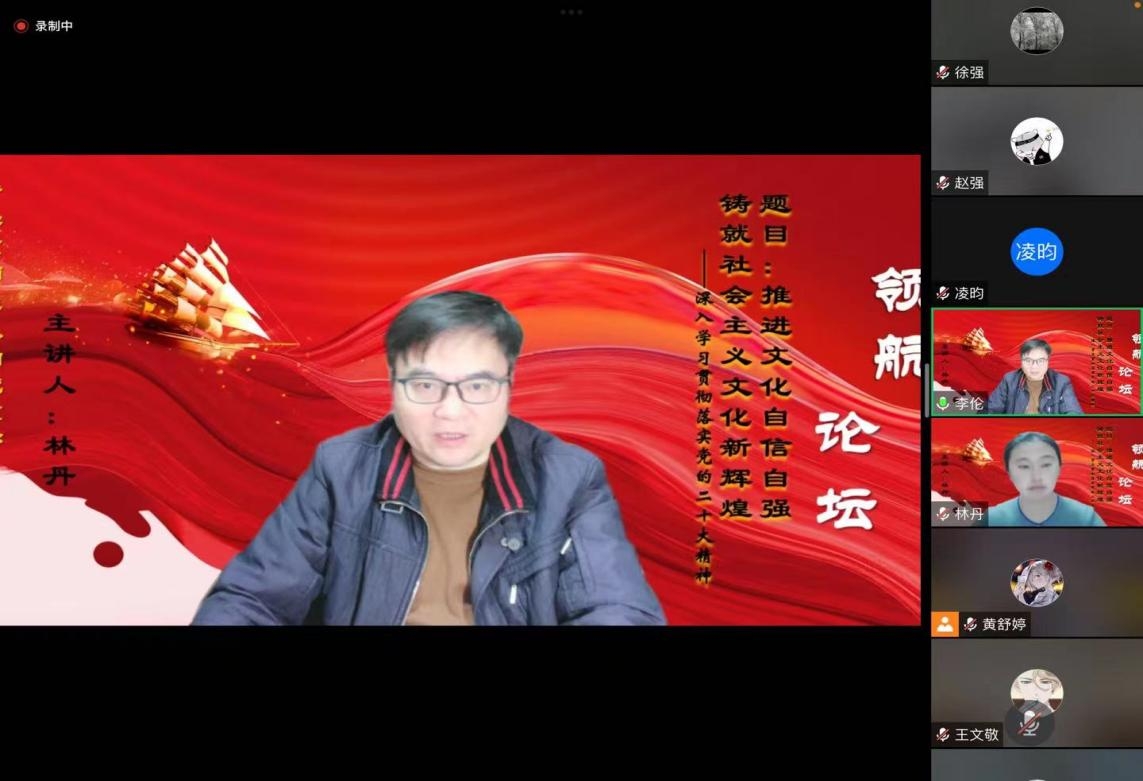 “领航论坛”第二期题目为“推进文化自信自强,铸就社会主义文化新辉煌”,主讲人为哲学系师生纵向党支部书记林丹。主题党课分为三个部分,林丹首先总结了党的二十大主题和主要成果,并指出了党的二十大的重要意义。其次回顾了过去五年的工作和新时代十年的伟大变革,并点明了伟大变革的里程碑意义。最后,围绕“文化自信自强”这一主题,概括了新的历史特点,并列举出党在文化建设中做出的伟大成就。在此基础上,指出文化自信自强在党的二十大报告的各领域都有鲜明体现,并提出了推进文化自信自强的具体措施。