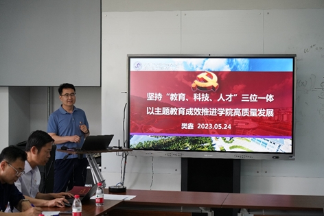 樊鑫以《坚持“教育、科技、人才”三位一体,以主题教育成效推进学院高质量发展》为主题作专题党课报告,从党的二十大提出“教育、科技、人才”三位一体的现实意义和战略考量出发,阐述了学校“三位一体”建设总体思路和学院特色化国际化建设着力点。他强调,要深入学习贯彻习近平总书记关于加强教育、科技、人才的重要论述,把握好新时代教育、科技、人才培养协同发展、日益交融的新趋势,准确对标学校学科总体规划,发挥面向国家重大战略和经济社会发展需求的引领作用,学院要围绕学校的“特色强、国际化、高质量、研究型”内涵定位,以中外双循环教学模式、高质量人才队伍和有组织的科研团队建设为重点开展“三位一体”建设,推动学院高质量发展。
