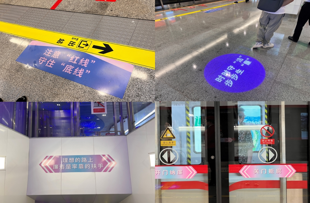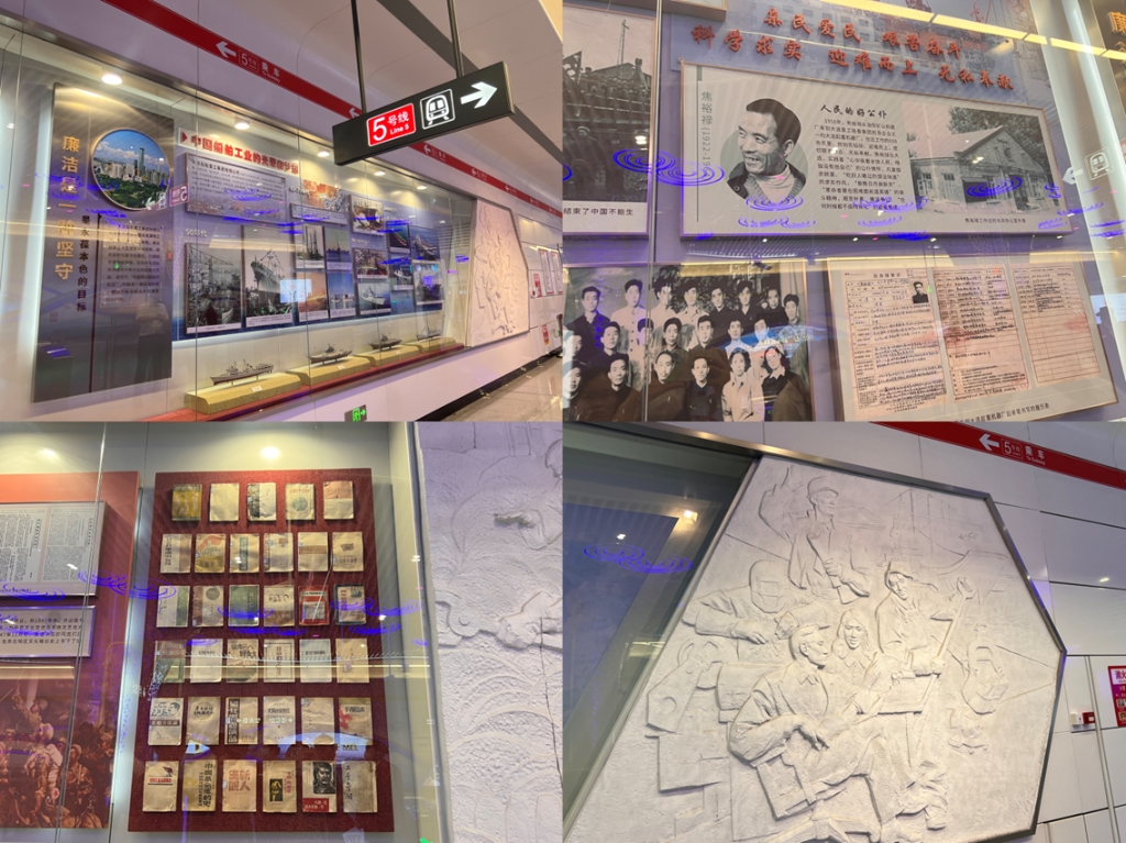 随后,大家乘坐地铁五号线到达位于青云街的大连市廉洁文化主题地铁站青云街站,青云街站是将博物馆与地铁站相融合,充分利用站内的公共空间,以“清风海韵廉润滨城”为主题,通过历史文物、视频影像、宣传标语全方位营造廉洁文化氛围。在讲解员的介绍下,大家参观了以大连百年发展历程为主要脉络的浮雕壁画文化墙,充分感受了这座城市的红色基因和时代精神,并通过观看五连屏播放的廉洁文化宣传视频,沉浸式体验了一场廉洁教育课,进一步激发教师党员提高廉洁意识、塑造良好师德师风。