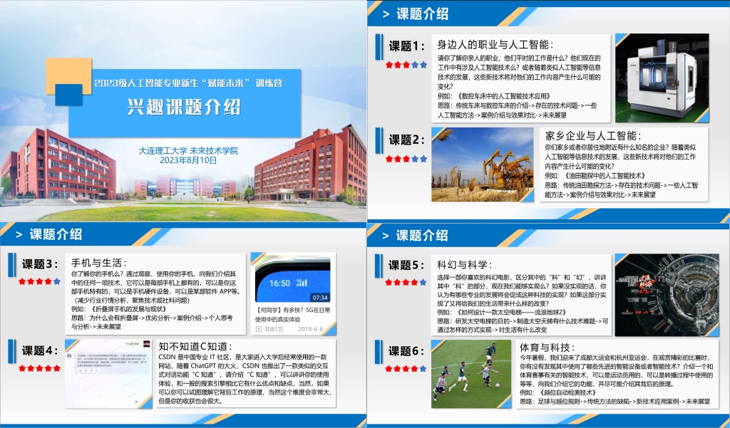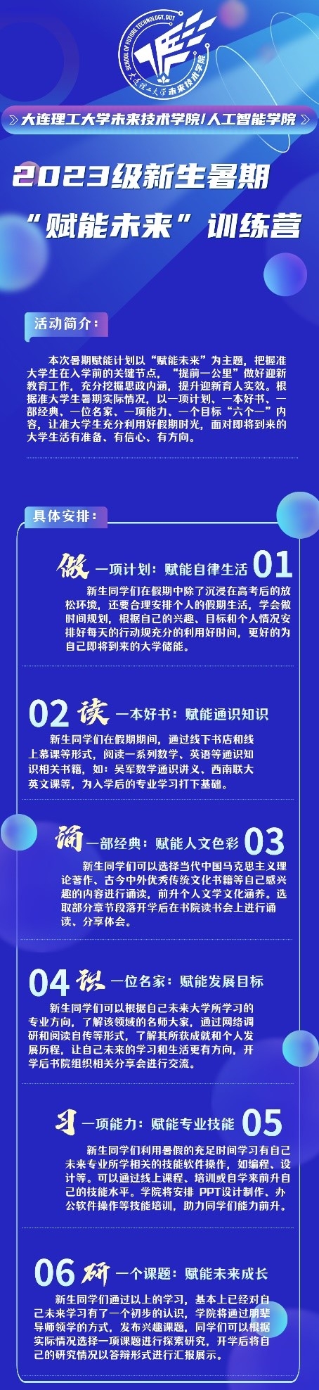 为引领2023级新生同学们着眼个人成长发展、着力解决未来前沿科技、着重国家人民需求,更好地适应大学生活,未来技术学院于8月10日开展新生暑期训练营开营仪式。训练营以“赋能未来”为主题,以“六个一”为主要内容,即做一项计划、读一本好书、诵一部经典、识一位名家、习一项能力、研一个课题,让新生同学们充分利用好假期时光,面对即将到来的大学生活有准备、有信心、有方向。未来技术学院党委委员、副院长郭艳卿出席活动、未来技术学院党委副书记、副院长孙智妍主持开营仪式,学院班导生、朋辈导师以及全体新生以线上线下结合的方式参与,大连地区新生线下参与了开营仪式。