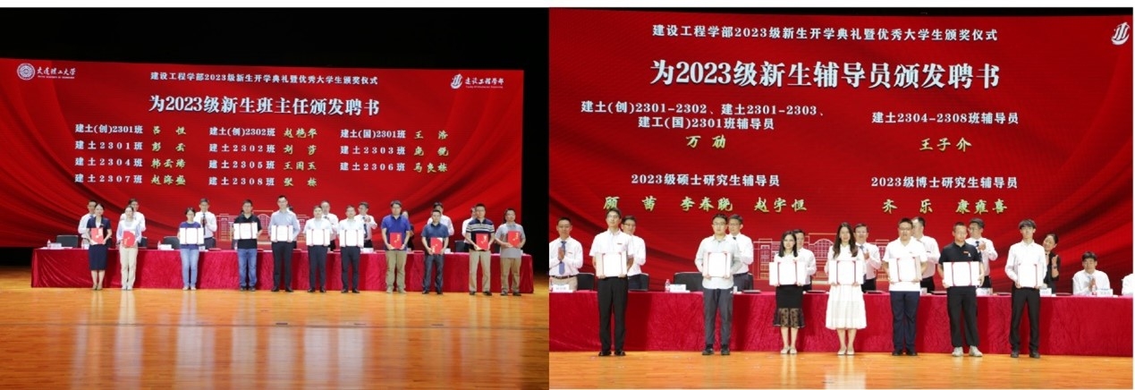 为培养新生爱校爱专业情怀,增强学生责任感、认同感与归属感,让更多家长见证学生成长成才重要时刻,8月31日新生报到当晚,建设工程学部在学生文化中心剧场隆重举行2023级新生开学典礼暨优秀大学生颁奖仪式。建工学部部长李钢,党委书记于龙,副部长李冬生,副部长吕林,副部长王胤,副书记兼副部长、纪委书记吕伟华,水利工程学院院长邹德高,港航与海洋工程学院院长马玉祥,土木工程学院副院长赵天怡,交通运输学院副院长钟绍鹏,建设管理系副主任窦玉丹等部院领导出席典礼。2023级全体新生、学生家长、班主任、辅导员以及在校生代表参加活动。典礼由建工学部党委副书记、副部长郭景晨主持。