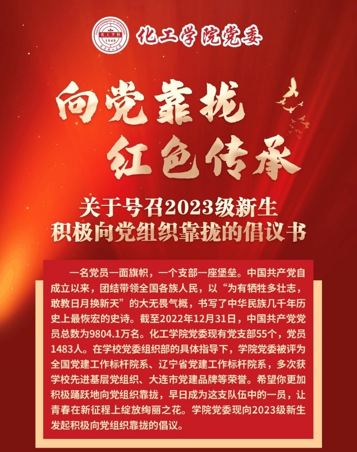 一名党员一面旗帜,一个支部一座堡垒。化工学院党委向全体2023级新生发起了积极向党组织靠拢的倡议,倡议新生积极递交入党申请书,不断坚定理想信念,勇挑时代重任。入党启蒙教育是新生入学教育的重要环节,旨在引导广大新生用初心砥砺信仰,用理论坚定信念,用实践增强信心,把青春报国的旗帜高高扬起。为全面建设社会主义现代化国家、实现中华民族伟大复兴的中国梦凝聚磅礴力量!