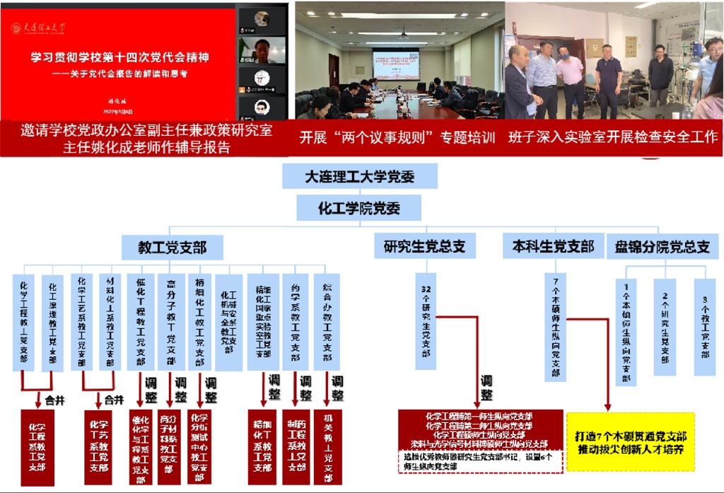 设置本硕贯通支部,推动本科生专业重塑、重构课程体系,打造7个本硕贯通支部。发挥科创竞赛育人功能,选派6名优秀教工担任研究生党支部书记,指导学生参加高水平竞赛。以化学工艺系教工党支部党员为主指导的“西天取腈”团队,荣获第十七届全国大学生化工设计竞赛一等奖。教工党支部书记李琳、“党员先锋示范岗·教书育人楷模”毛庆等指导的“凌距离”队在“第七届中国大学生Chem-E-Car竞赛”中获“性能竞赛一等奖”。创建32个研究生党支部实验室管理“先锋阵地”,让研究生把党员身份亮出来,把卫生水电安全管起来。创建本科生党员“三个一”工程,形成党建带团建的育人体系。打造“青春会客厅”,从论文写作、学业规划等学生关注的方面,邀请专业人士和有经验的师生与学生面对面交流分享经验。2名学生党员获评辽宁省优秀大学生党员。