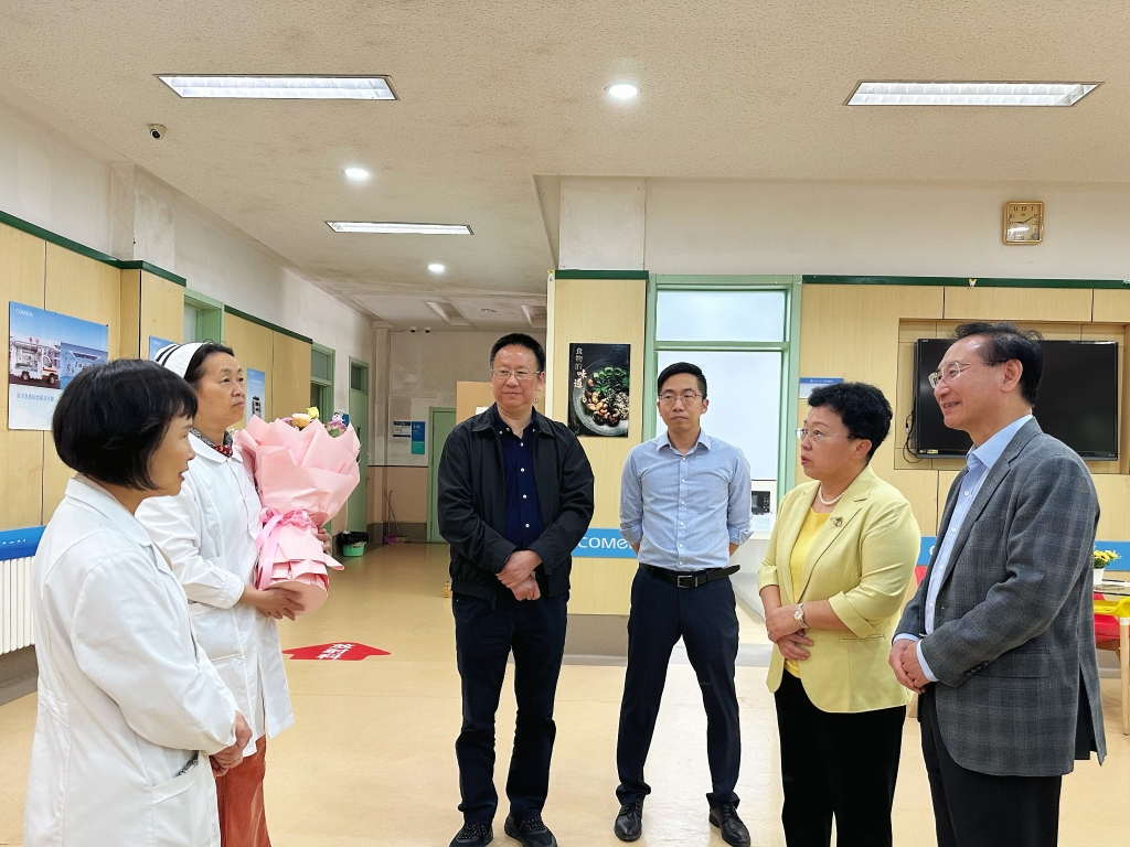在第113个国际护士节来临之际,5月11日上午,校工会主席屈丽红,医学部部长曲鹏、党委书记兼常务副部长覃开蓉一行走访慰问校医院全体医护工作者,并致以节日的问候和祝福。