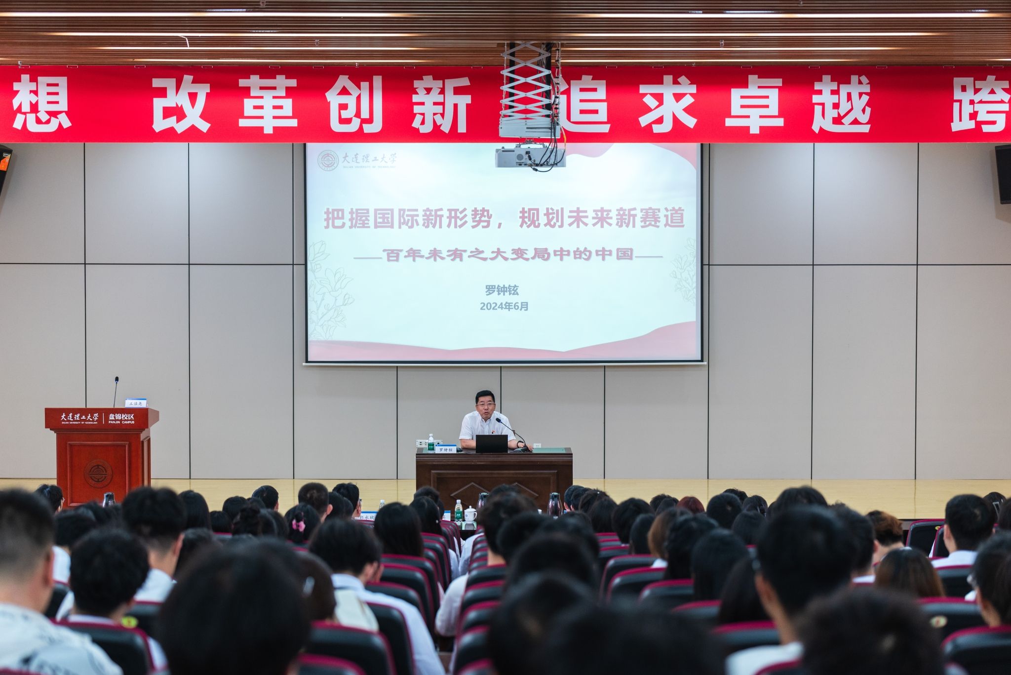 为推进党纪学习教育走深走实,激励全体毕业生党员坚定信念、胸怀祖国,牢记党员责任、脚踏实地,以良好的精神风貌踏入新的征程,6月14日下午,校党委常委、副校长兼盘锦校区党工委书记罗钟铉讲授专题党课,校区领导班子成员、各学院党委书记及248名毕业生党员、研究生党员一起聆听党课,党课由2020级本科生毕业党员王佳尧主持。