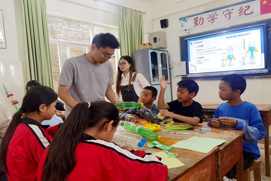 在大垭口村,“梦起云滇,情系龙陵”支教实践团充分结合力航专业的特色,带领山乡孩子们开展水火箭制作、纸牌承重实验等教学活动。10岁的杨定荣兴奋地说:“你看,这是大哥哥和大姐姐们教我制作的水火箭,只需要往水火箭里注入一半的水,把气打进去,然后再用发射器把水火箭发射出去,就能飞出去20多米。”当天,冒着淅淅沥沥的小雨,随着一个个水火箭成功发射,孩子们也欢呼起来。