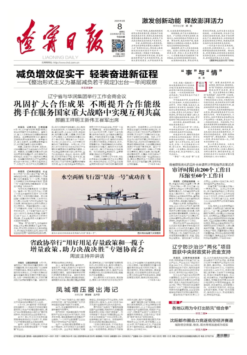 本报讯 记者曲琦报道 载重50公斤的飞行器从远处平稳飞来,精准降落在水面上,随后向前航行,紧接着又成功垂直起飞……日前,大连理工大学教授方旭和学生研发的“星海一号”水空两栖电动垂直起降飞行器在大连首飞测试成功。
