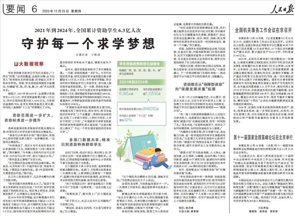 “学生资助政策中的一些举措,如提高服兵役和基层就业学生的学费补偿、助学贷款代偿及减免标准等,兼具经济杠杆作用与社会价值导向作用。”朱富言表示,这不仅可以直接减轻学生负担,而且能够引导人才流向国家所需领域,从而构建起“个人发展—社会责任—国家建设”的正向循环,有利于推动教育公平与人才资源优化配置。《人民日报》(2025年12月25日 第 06 版)