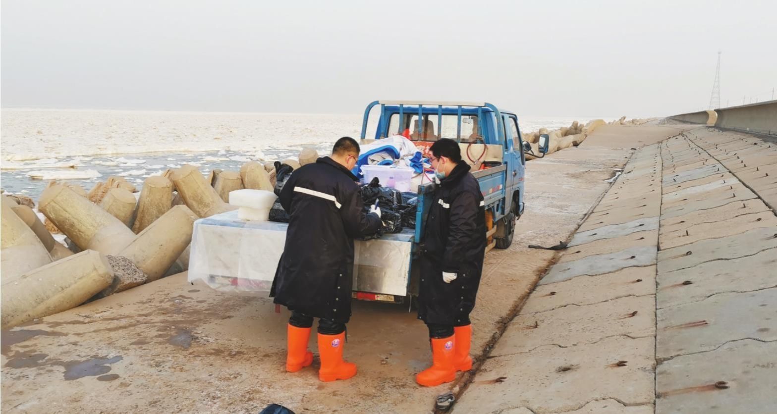 图② 2021年,科研人员正将在东营港海域采集的冰样运回实验室。