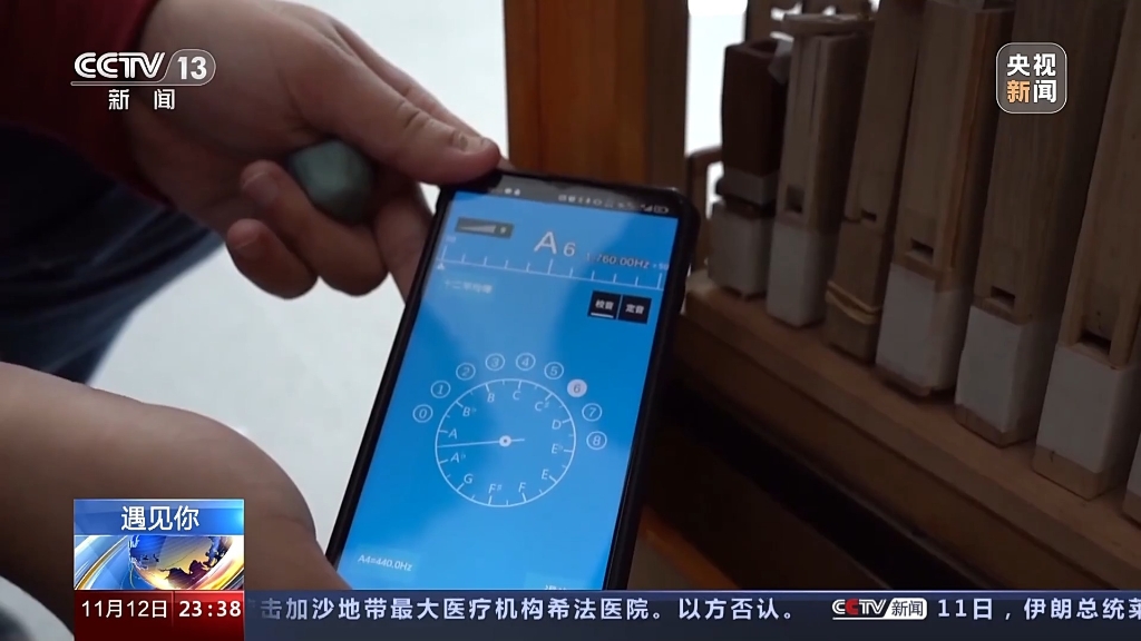 王小虎:我们这个琴里面一共有102根音管,放在这么狭小的空间内,而且我们的音管也是各具特色,我们最小的音管其实是用一根毛笔管制作而成的,非常小巧,我给大家吹一下它的声音,(吹音管声)特别清脆,最长的音管放在下侧,它是一个C形音管,有1米4的长度,我们要把它折成两折,折成一个C字形才能塞到我们这个下层框架中。