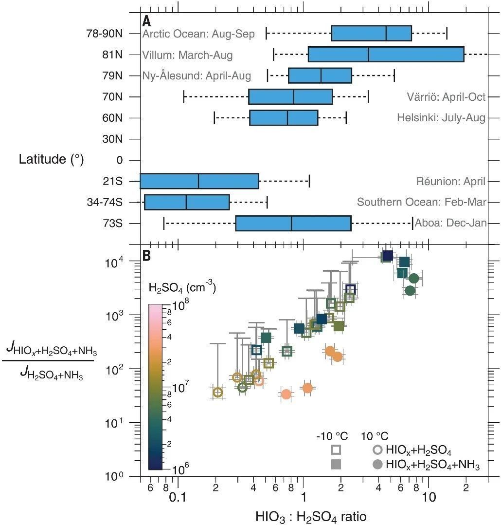 图2 全球各地检测到的HIO3:H2SO4比率(A)及HIOx对颗粒物形成的促进效应(B)