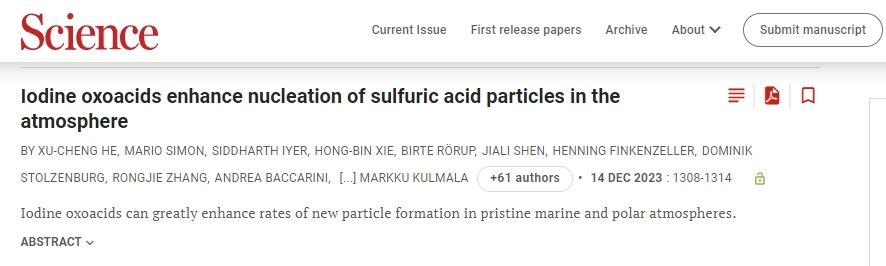 12月15日,我校环境学院谢宏彬教授团队在大气颗粒物形成机制方面取得突破性进展,成果“碘氧酸增强大气硫酸颗粒物的成核”(Iodine oxoacids enhance nucleation of sulfuric acid particles in the atmosphere)在国际期刊《科学》(Science)上发表。