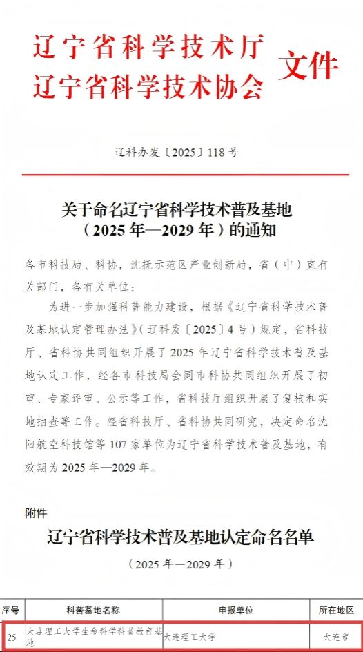 近日,辽宁省科学技术厅、辽宁省科学技术协会联合发文公布了最新认定的辽宁省科学技术普及基地(2025年—2029年)名单,我校生物工程学院申报的大连理工大学生命科学科普教育基地顺利获批。