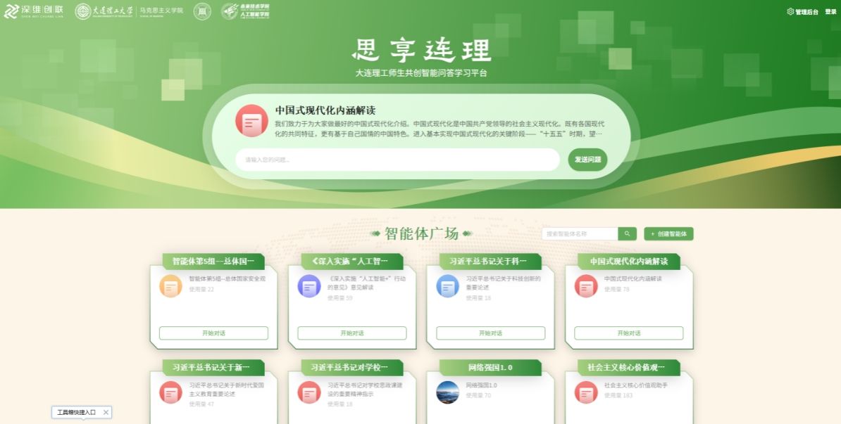 本学期,团队成员王嘉教授、隋林宁老师、李奇峰老师,依托国家一流本科课程“思想道德与法治”建设平台与未来技术学院人才培养与技术优势,指导未来技术学院2025级本科生共创“思享连理”思政课智能体广场,推动我校“德法”课数智化教学改革。“思享连理”思政课智能体广场是一个专注于学习、思考、分享思想政治理论知识的集成式智能交互平台,支持师生根据特定理论主题,自主创建个性化思政智能体。教学团队创新设计智能体的核心功能、主题定位、语料资源及技术架构等建设方案,并指导学生完成多模态语料库构建、智能体版块设计与模型训练等教学环节,形成了师生共创、共享的智能化思政课教学新形态。授课学生围绕中国式现代化、总体国家安全观等教学重难点展开深入学习,构建了包括“习近平总书记说”“影音资料”等6个一级模块,近200万字的多模态智能体语料库,创建了15个思政课主题智能体。