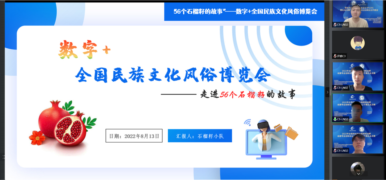 8月13日,第十六届全国高校商业精英挑战赛会展专业创新创业实践竞赛辽宁赛区选拔赛于渤海大学成功举办。辽宁省共有25所院校3000余人报名参赛。结合当前疫情防控形势,赛区总决赛在线上举行,经过专家网络评审,线上路演答辩角逐,共评出辽宁赛区学生组一等奖40个项目、二等奖46个项目、三等奖54个项目。来自我校的“石榴籽”团队在本次比赛中荣获辽宁省一等奖及辽宁省总决赛最佳人气团队奖。项目指导教师陈奡册、李航获辽宁赛区总决赛优秀指导教师奖。