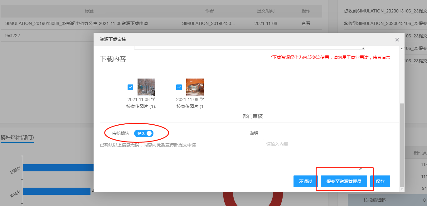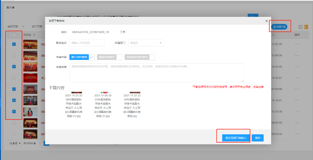 4.在列表页勾选多张图片点击“申请下载”,进入资源审核页面,填写相关信息,提交至部门审核人进行审核(注:因服务器运算限制,总计资源下载大小请维持在100M以内)