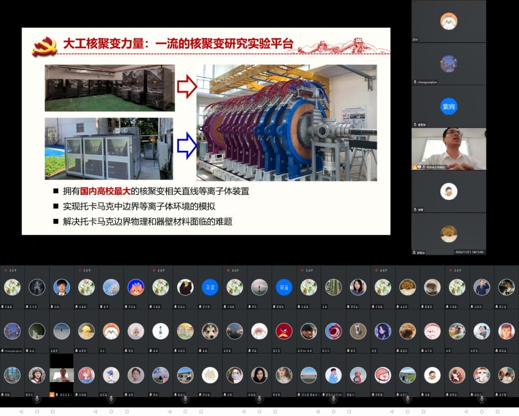 11月21日,物理学院党委落实学校党委部署,推进学院学习贯彻落实党的二十大精神“奋进新征程”系列活动,邀请学校学习贯彻党的二十大精神师生宣讲团成员、物理学院等离子体物理教工党支部书记桑超峰教授,为学院全体师生党员作《加强科技创新 推动核聚变能发展》专题报告。