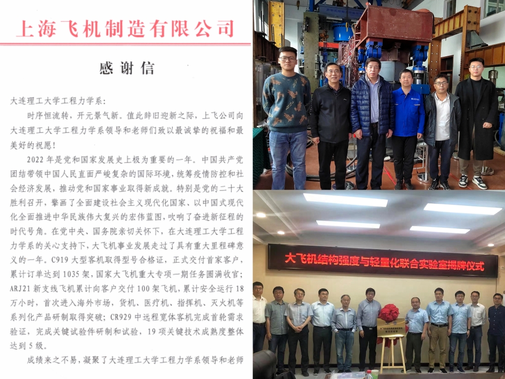 学部工程力学博士生导师纵向党支部推动完成2022年度中国商飞难度和规模最大,首次在高校实验室完成的飞机复合材料综合性测试——CR929宽体飞机3m级盒段试验,同时,支部成员参与研发的中国首架具有完全自主知识产权的大型客机C919多次得到校内外媒体报道。计算力学教工党支部引领支部成员参与“中国商飞-大连理工大学飞机结构强度和轻量化联合实验室”建设,助力大连理工大学成为商飞集团“最佳合作伙伴”;积极推进“大连理工大学-中国航空工业集团飞机精细化强度设计与制造联合技术中心”建设,为多个型号作出贡献。重点实验室教工第一党支部引领支部成员推动计算力学、仿生力学、生物力学在新能源的构件设计、矿筑坝构建等重大工程以及肿瘤诊疗等生物医疗领域应用,获批国家重大项目课题1项、国家重点研发计划项目(政府间重点专项)1项、国家重点研发计划项目子课题2项。