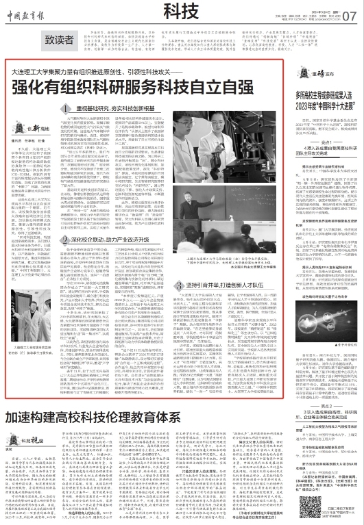 “面对科技发展,特别是国家战略需求,我们要以重大科研任务为牵引,以重大科研平台和创新团队为依托,以产教融合、科教融汇为重要方式,集成有组织科研的力量,推动实现基础研究和关键核心技术重大突破。”中国工程院院士、大连理工大学党委书记项昌乐说。