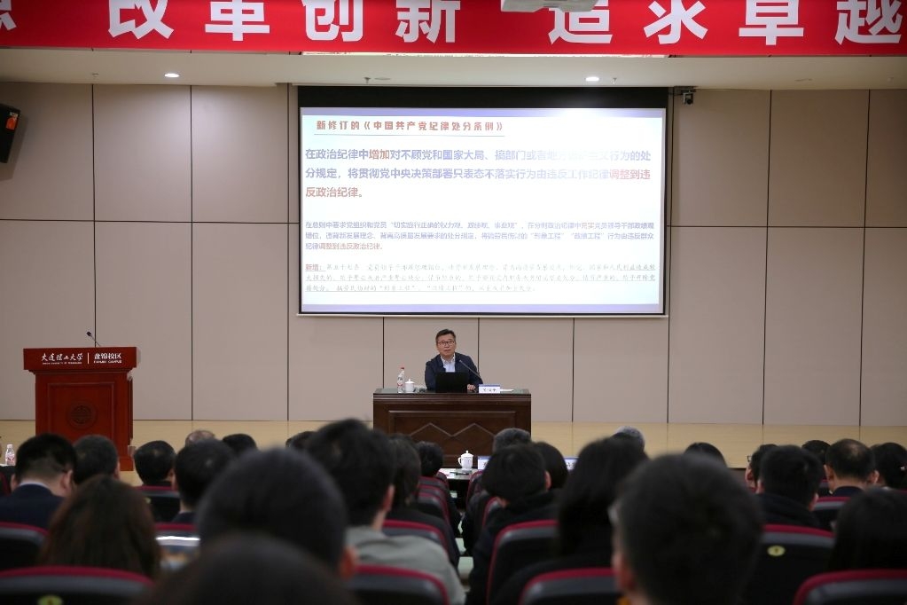 学校党委副书记、纪委书记吴松全在盘锦校区干部培训班作题为《把“四早”监督进行到底——敢为善为而不妄为 遵规守纪印刻在心》的报告,引领校区党员干部深入学习《条例》。学校纪检监察机构全体干部持续深入二级学院等开展“送纪法进基层”集中宣讲,走进学院中心组学习、师生党支部、青年学生党员教育培训班、科研团队等,重点围绕《条例》,结合高校领域违纪违法典型案例开展集中宣讲和警示教育,目前已经走进27家二级单位。学校新闻网开设【党纪学习教育】专栏,各级党组织通过网页、微信公众号等形式,宣传学校开展党纪学习教育情况。校内各单位注重结合学校“卓越发展年”各项目标任务,针对性地开展专题学习,着力营造好良好的政治生态环境,全力助推一流大学建设。