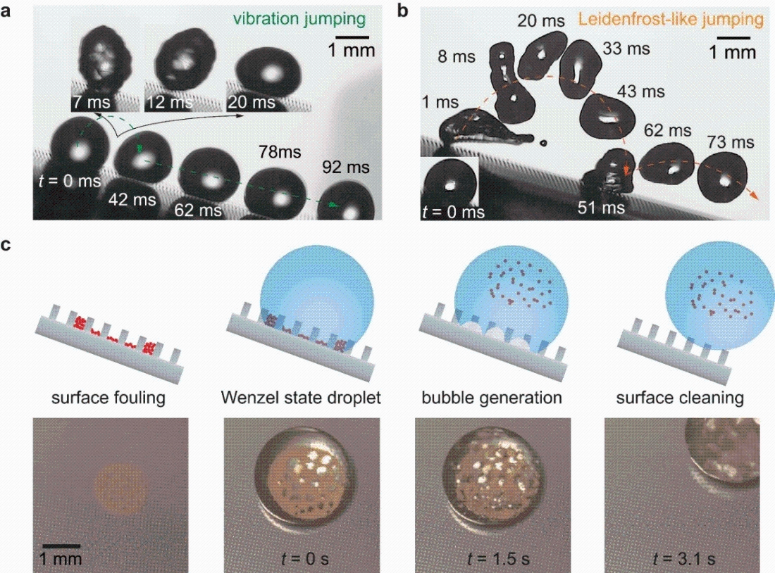 装备表面常引入微肋片、微凸起等微结构以实现强化传热和减阻等功效,而沉积在微结构深处的杂质对其安全高效运行带来极大挑战。采用水射流等方式可以迫使水进入表面结构深处以溶解杂质,但是咖啡环效应导致其干燥后仍具有较多杂质残留;高温状态的莱顿弗罗斯特效应可以消除咖啡环效应,但是蒸汽层的存在却使得水难以进入结构深处。基于该工作的低温可控莱顿弗罗斯特效应可利用加热升温后的蒸汽使结构深处沉积物脱落悬浮,并随液滴自发从表面脱离,为结构表面深度清洁开辟了新的途径。