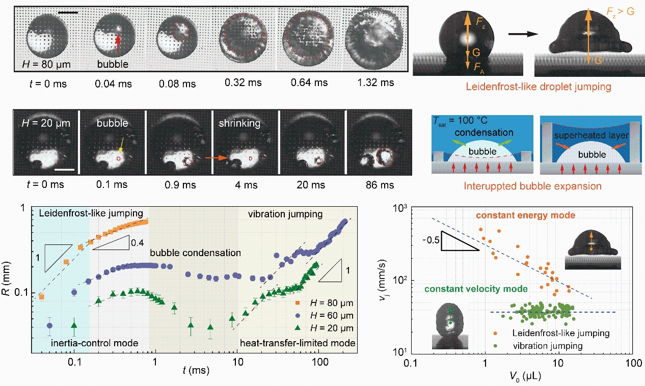 该研究突破了传统莱顿弗罗斯特效应的限制,仅需130 ℃表面温度即可实现蒸汽驱动的液体快速悬浮(1.33 ms)。本研究在固-液-汽三相界面复杂热质传递过程中,发现了表面微结构、蒸汽泡扩张、热边界层形成及液体悬浮之间的有序关联,并结合实验现象、理论分析与传热仿真揭示了热边界层内部蒸汽泡的惯性驱动扩张与热边界层主导的蒸汽泡传热受限扩张的机理。进一步,通过改变微柱阵列的高度控制水滴在恒定能量的莱顿弗罗斯特快速悬浮和恒定速率的振荡弹跳之间切换。