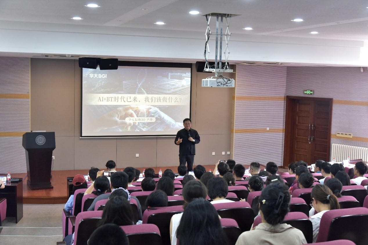 7月9日下午,华大集团CEO尹烨先生做客“百川讲堂”第255期暨生物工程学院“知微育见”大讲堂第28期,针对时代科技热点,以“AI+BT时代已来,我们该做些什么?”为主题,带领现场师生领略科技与生物交汇的魅力。学校党委副书记、副校长张言军,生物工程学院院长贾凌云,华大基因东北区域总经理苏航以及来自校团委、生物工程学院的教师代表、华大集团一行来宾,260余名来自生物工程学院等各个学院的青年学生、百川会员等共同于主楼第二报告厅听取讲座。讲座由生物工程学院党委书记杨君主持。