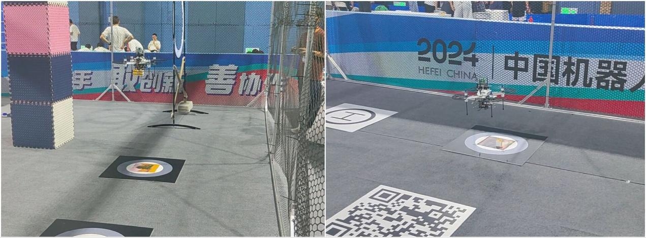 参赛团队自主研发了高实时、精确的定位与建图算法,并训练了可靠的视觉模型,精心设计了鲁棒控制算法。在决赛的舞台上,我校参赛团队展现了无畏挑战、敢于突破的科技先锋精神。无人机在起飞后快速扫描了二维码,并通过视觉识别精确地完成了在目标靶的识别以及物块投递任务,迅速地完成了圆环的穿越,且精准地着陆在指定的降落点内,以1分15秒的满分成绩勇夺冠军,比赛成绩远优于其他参赛队伍。