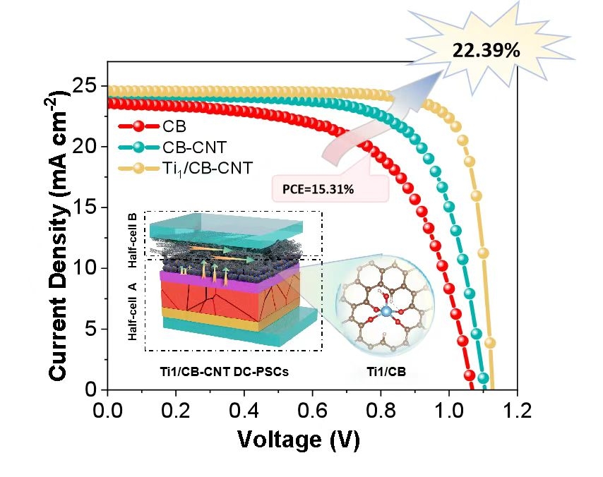 在史彦涛教授的指导以及国家级大学生创新创业训练计划项目和我校“优秀本科生基础研究专项”的资助下,程嘉硕充分利用化学强基班特色的化学研究训练课程,以及课余和寒暑假时间,完成炭黑担载钛单原子的碳电极材料Ti1/CB的制备,其功函数从4.02eV提高到4.26eV,实现了与相邻功能层的良好匹配。随后,在碳电极中引入了一维碳纳米管,通过其与零维炭黑的协同作用形成了具有优异界面接触性能的弹性导电网络,为高效的载流子转移提供了有利条件。这些策略使得碳基钙钛矿太阳能电池的光电转化效率显著提高至22.45%。在连续工作1000小时后,其光电转化效率仍保持在初始值的95%以上,展现出卓越的稳定性。