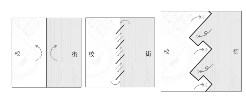 获奖作品《街墙与围墙》,聚焦城市街道与校园空间的关联。当下中国城市里,小区、学校等围墙割裂了连续街墙,影响步行体验。作品选取对围墙依赖度高的中学校园进行优化,以“缩街”理念,在校园与街道边界增设设施,推动二者渗透融合。例如,利用学校节假日闲置资源向公众开放,借助城市空间为高中生创造社会活动契机,满足双方需求,强化互动。
