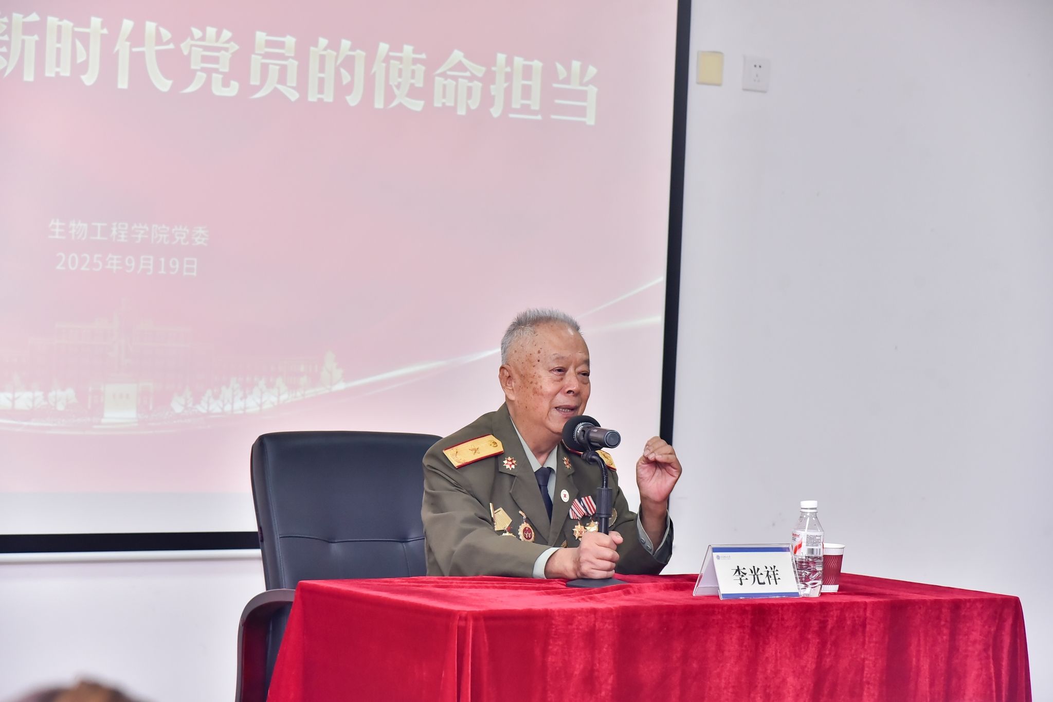 为纪念抗日战争胜利80周年,传承抗战精神,厚植家国情怀,9月19日上午,生物工程学院党委邀请中国人民解放军原第64集团军副政委李光祥将军做客“铸魂育人”名家讲堂,开展“抗战精神与新时代党员的使命担当”主题讲座,学院领导班子成员及全体师生党员共同参加活动。活动由学院党委组织员姜惠主持。