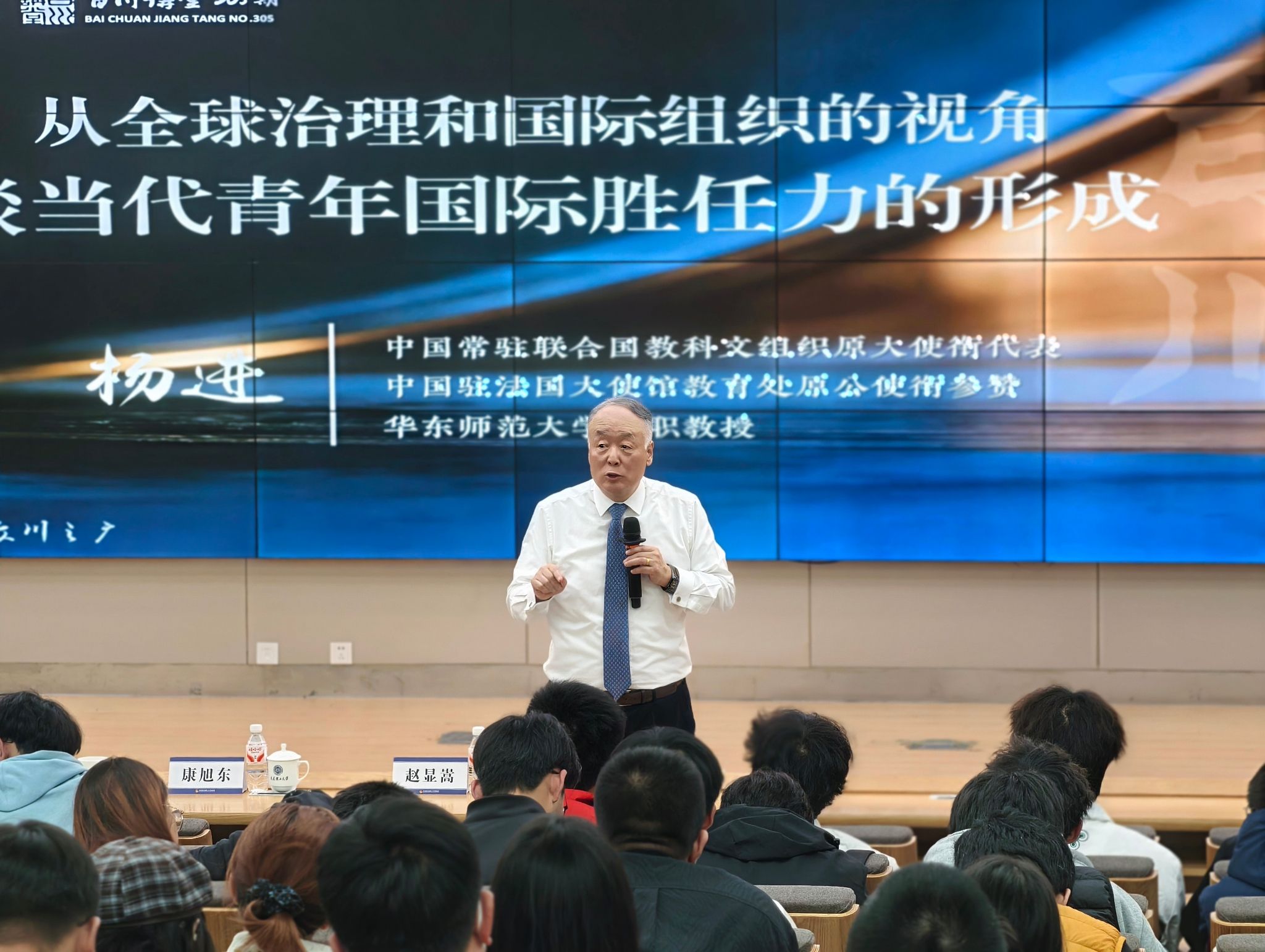 胸怀天下担使命,全球视野育英才。4月9日,中国常驻联合国教科文组织原大使衔代表、中国驻法国大使馆教育处原公使衔参赞杨进做客我校“百川讲堂”第305期,带来主题为《从全球治理和国际组织的视角,谈当代青年国际胜任力的形成》的专题讲座。副校长康旭东,校团委书记赵显嵩,以及来自校团委、光电工程与仪器科学学院的教师代表,各学院、书院的本研团支部青年、团校学员共计300余人到场聆听讲座。