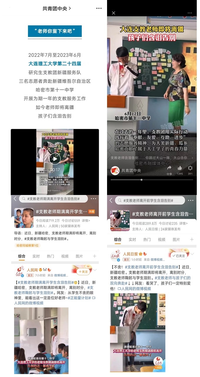 近日,人民日报、人民网、共青团中央、中华全国学联、中国青年报、新疆共青团、辽视等官方媒体转发报道我校研究生支教团事迹,截至目前,点击量超3000万,获60万点赞,近7000条评论。