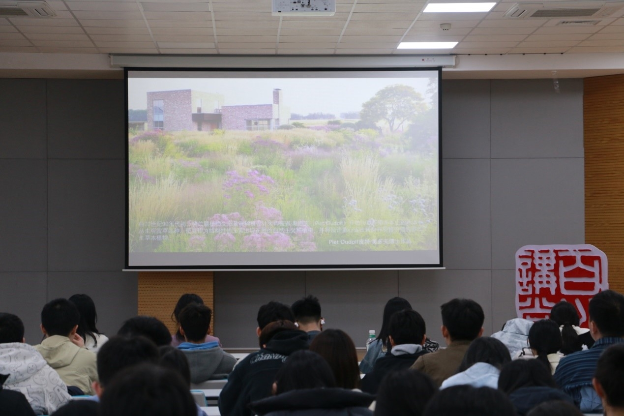 讲座中,杭烨阐述了她对植物设计的深刻思考,她表示,将自然景观的力量转化为城市景观,必须提炼并放大植被特征,使其清晰可辨。她通过丰富多彩的图片和案例展示,向同学们展示了不同植物之间搭配所营造的奇妙效果和独特魅力;深入剖析了自然景观设计的核心理念及其在中国文化背景下的应用与探索,让城市与自然融合共生,推动经济、环境和社会效益最大化。