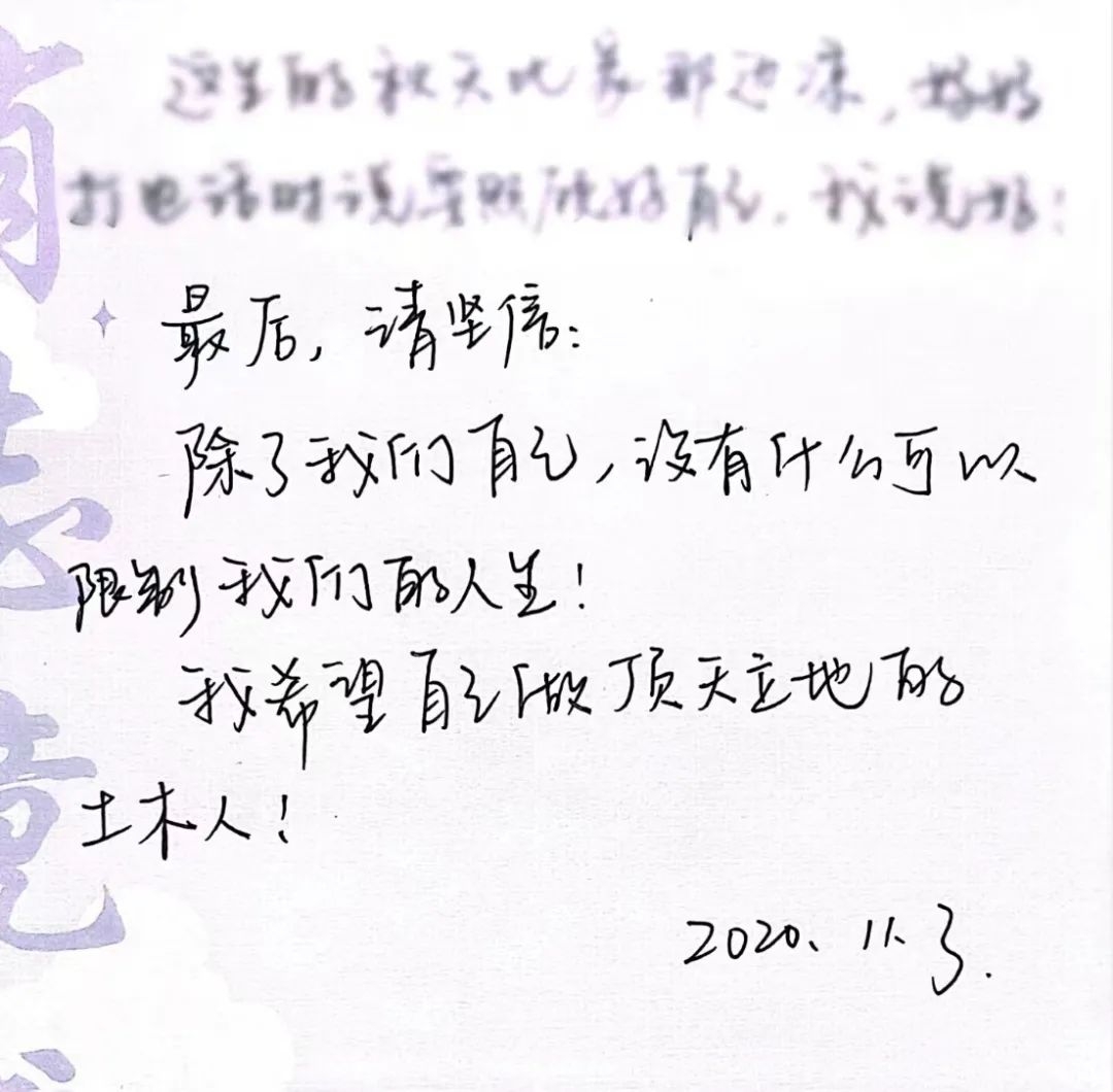 做一名“六边形战士”从来都不容易,但此时正青春,探索和拼搏正当时。正如三年前她信中的结尾:“除了我们自己,没有什么可以限制我们的人生!我希望你做顶天立地的土木人!”方紫欣的故事仍在继续,顶天立地的豪情壮志,也将随着她的步步成长慢慢实现。