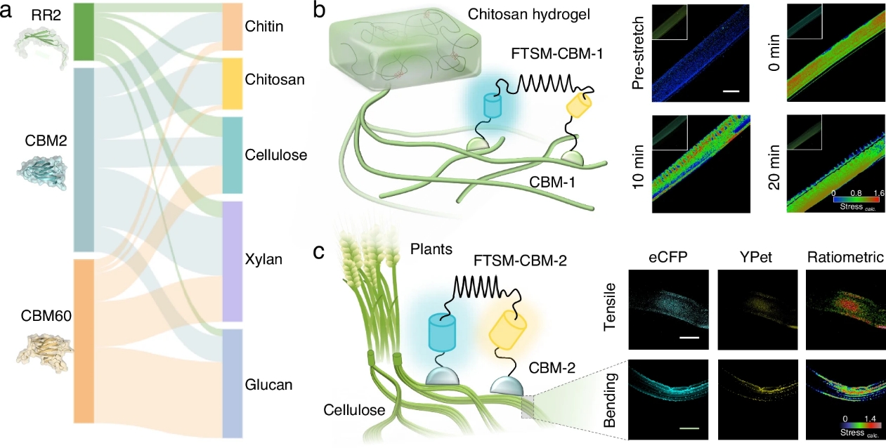 进一步地根据待测物的差异,作者筛选了不同的碳水化合物结合域,并设计了FTSM-CBM-2,实现更广谱的生物材料的可视化应力检测。例如,对植物茎秆的弯曲应力可视化将有助于抗倒伏作物品种筛选。