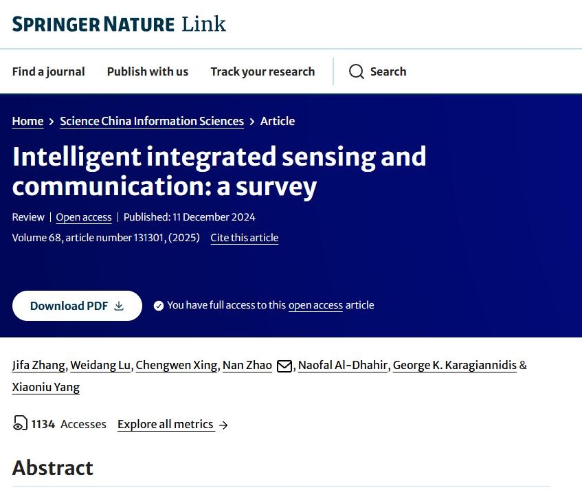 近日,信息与通信工程学院赵楠教授及2023级博士张吉发,与浙江工业大学卢为党教授、北京理工大学邢成文教授、美国德克萨斯大学达拉斯分校(University of Texas at Dallas)AI-Dhahir教授、塞萨洛尼基亚里士多德大学(Aristotle University of Thessaloniki)Karagiannidis教授合作开展智能通感一体化前沿综述研究,并以“智能通感一体化:综述”(Intelligent integrated sensing and communication: a survey)为题在《中国科学:信息科学(英文版)》(Science China Information Sciences)杂志发表。