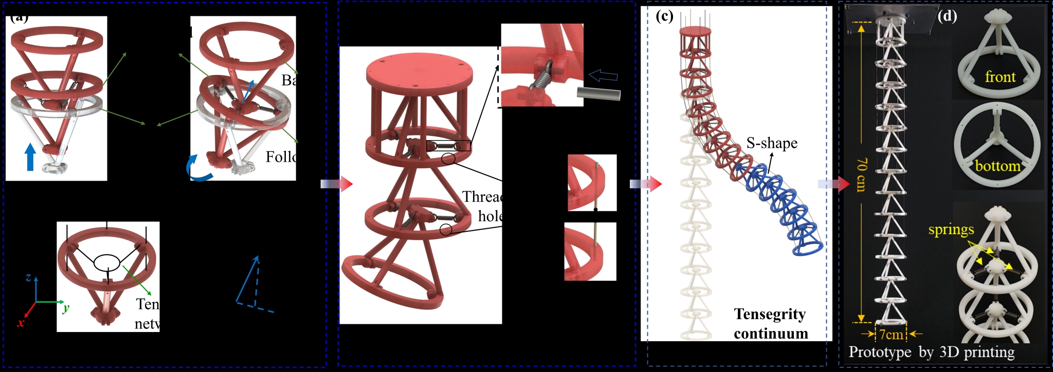 连续型机器人因自身细长结构特点和连续大变形能力,具有出色的狭小环境适应性和人机交互安全性等优势。特别是在完成柔顺和灵巧操作任务时,需要连续型机器人末端具备精准“定位”和“对正”技术能力。然而,当前研究工作主要侧重末端位置的精准控制,忽略了对末端姿态的控制。为解决此痛点问题,该研究首先基于仿生学思想,设计了一种基于张拉整体结构的仿脊椎张拉连续型机器人(tensegrity continuum robot,TCR)(见图1)。
