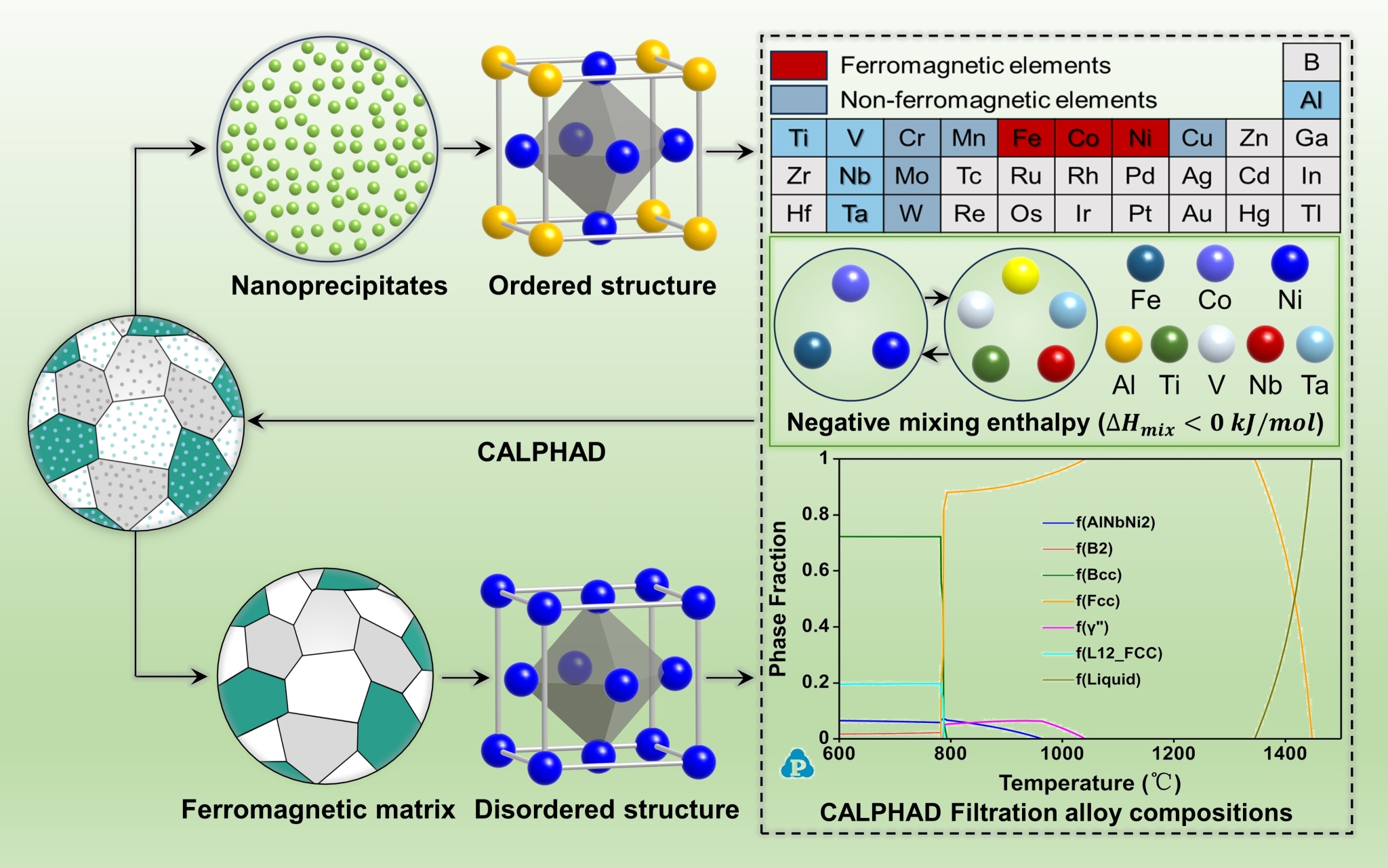 图1.负混合焓策略指导高强韧软磁高熵合金设计示意图