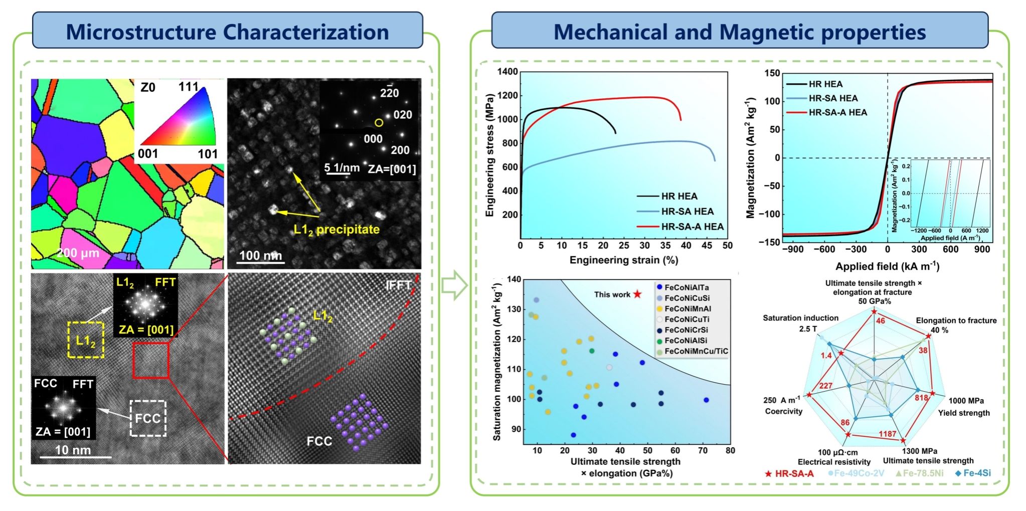 团队成功设计出新型Fe-Co-Ni-Al-Nb-B系高熵合金,微观组织由无序的FCC基体和与基体共格的有序纳米相构成,合金展现出优异的软磁性能(135.28Am2kg-1,227.54Am-1)和拉伸力学性能(1187.5MPa,38.7%)组合,同时在居里温度以下展现出超高的稳定性,综合性能远优于传统软磁材料以及已报道的软磁高熵合金,为新一代结构功能一体化高强韧软磁材料的设计和发展提供了新的思路。