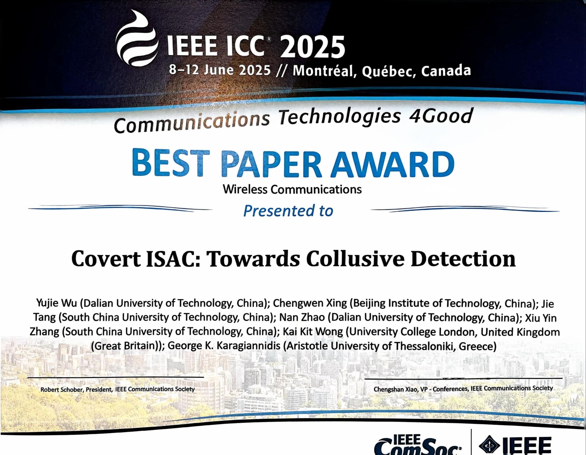 6月8日至12日,IEEE国际通信大会(IEEE International Conference on Communications,ICC)在加拿大蒙特利尔举办。本次大会上,我校信息与通信工程学院赵楠教授及2024级博士研究生伍玉洁,联合北京理工大学邢成文教授、华南理工大学唐杰教授与章秀银教授、伦敦大学学院(University College London)Kai-Kit Wong教授以及塞萨洛尼基亚里士多德大学(Aristotle University of Thessaloniki)Karagiannidis教授共同完成的论文“隐蔽式ISAC:面向共谋检测的通感一体化技术”(Covert ISAC: Towards Collusive Detection)在众多参评论文中脱颖而出,获得本次大会最佳论文奖(Best Paper Award)。该论文是大工首次获得IEEE ICC最佳论文奖,IEEE国际通信大会也是我校学术贡献评价体系通信方向唯一入选会议。论文第一作者为伍玉洁,赵楠为指导老师。